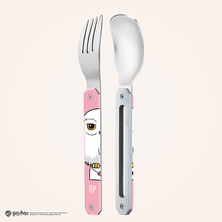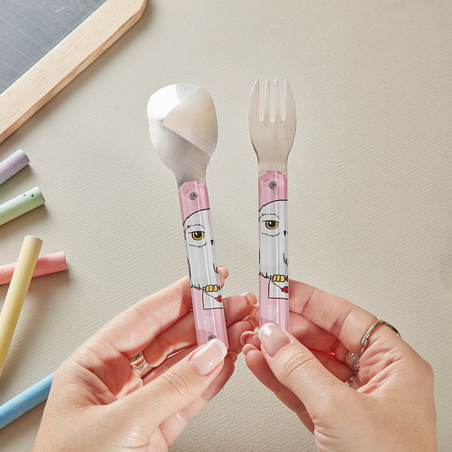 Besteck aus martensitischem Edelstahl 2CR14, hochglanzpoliert. Bestehend aus einem Löffel und einer 4-zahnigen Gabel. Dekorierter, transparenter Polymer (PC)-Griff. Fixierung mittels verbautem Magnet. Geliefert mit einem Trageetui aus Hartpolypropylen (PP). Spülmaschinenfest.