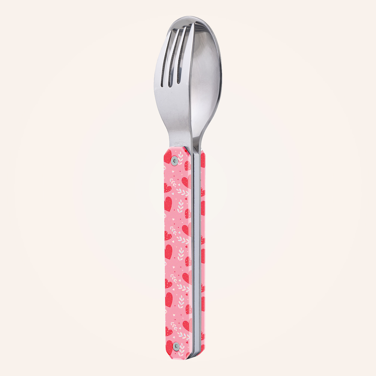 Besteck aus martensitischem Edelstahl 2CR14, hochglanzpoliert. Bestehend aus einem Löffel und einer 4-zahnigen Gabel. Dekorierter, transparenter Polymer (PC)-Griff. Fixierung mittels verbautem Magnet. Geliefert mit einem Trageetui aus Hartpolypropylen (PP). Spülmaschinenfest.