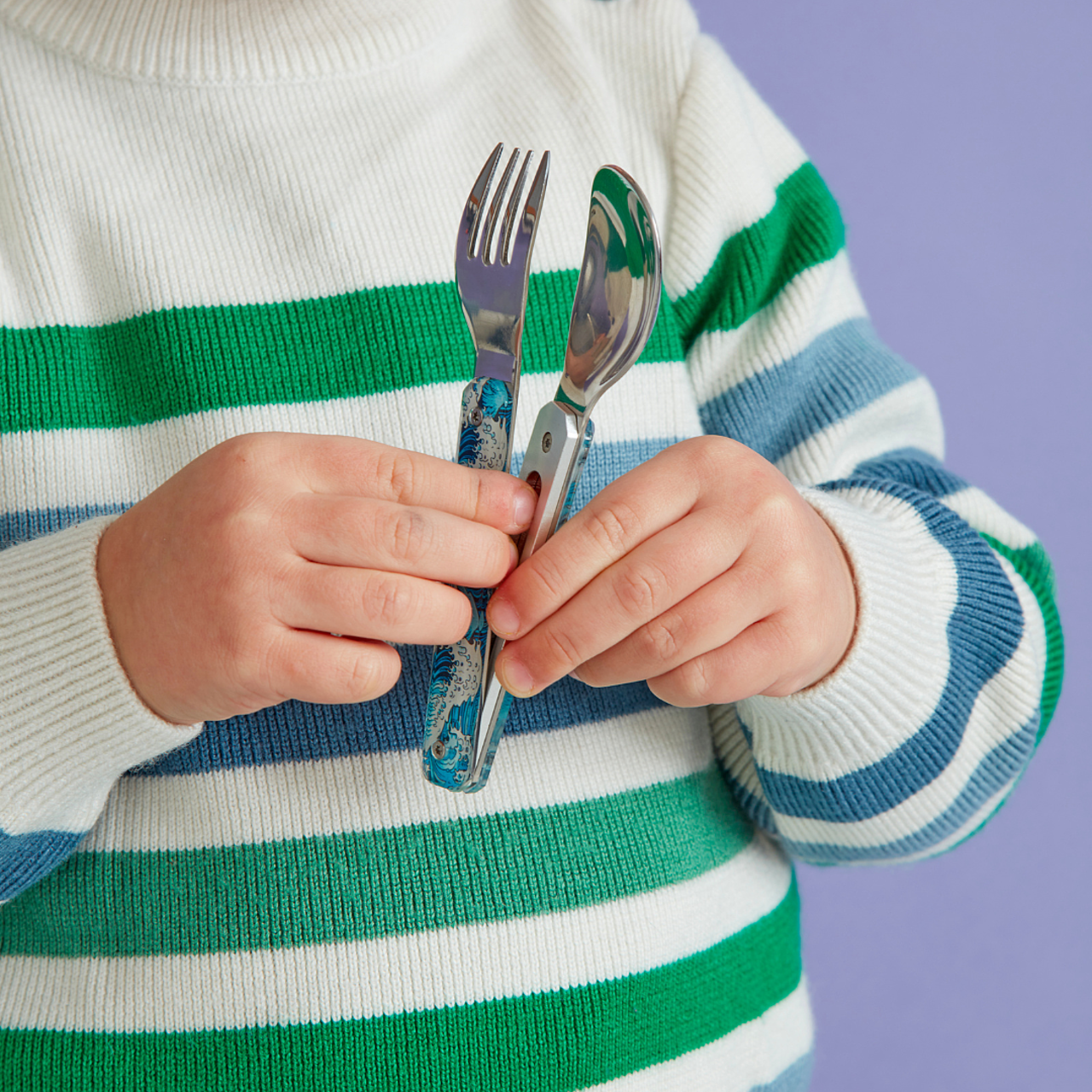 Besteck aus martensitischem Edelstahl 2CR14, hochglanzpoliert. Bestehend aus einem Löffel und einer 4-zahnigen Gabel. Dekorierter, transparenter Polymer (PC)-Griff. Fixierung mittels verbautem Magnet. Geliefert mit einem Trageetui aus Hartpolypropylen (PP). Spülmaschinenfest.