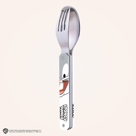 Besteck aus martensitischem Edelstahl 2CR14, hochglanzpoliert. Bestehend aus einem Löffel und einer 4-zahnigen Gabel. Dekorierter, transparenter Polymer (PC)-Griff. Fixierung mittels verbautem Magnet. Geliefert mit einem Trageetui aus Hartpolypropylen (PP). Spülmaschinenfest.