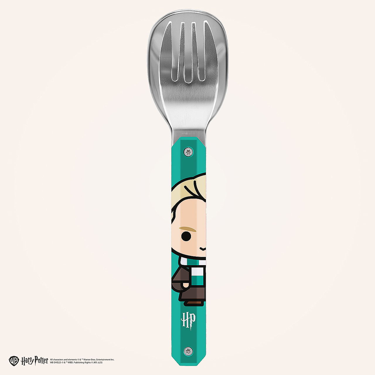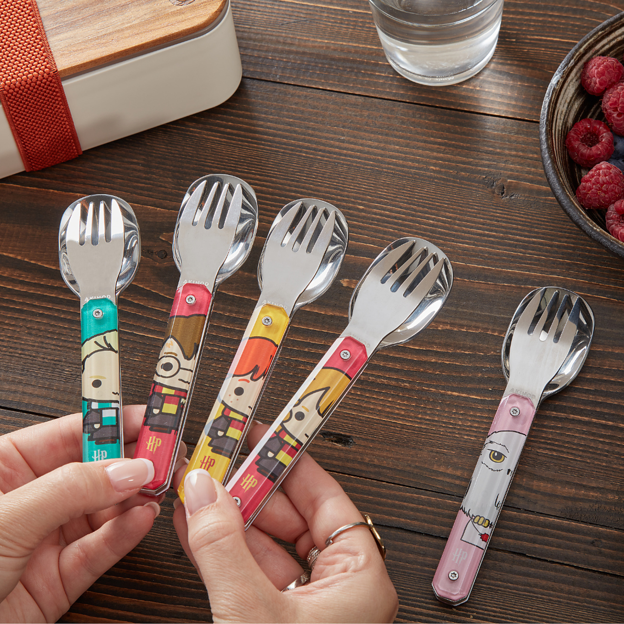 Besteck aus martensitischem Edelstahl 2CR14, hochglanzpoliert. Bestehend aus einem Löffel und einer 4-zahnigen Gabel. Dekorierter, transparenter Polymer (PC)-Griff. Fixierung mittels verbautem Magnet. Geliefert mit einem Trageetui aus Hartpolypropylen (PP). Spülmaschinenfest.