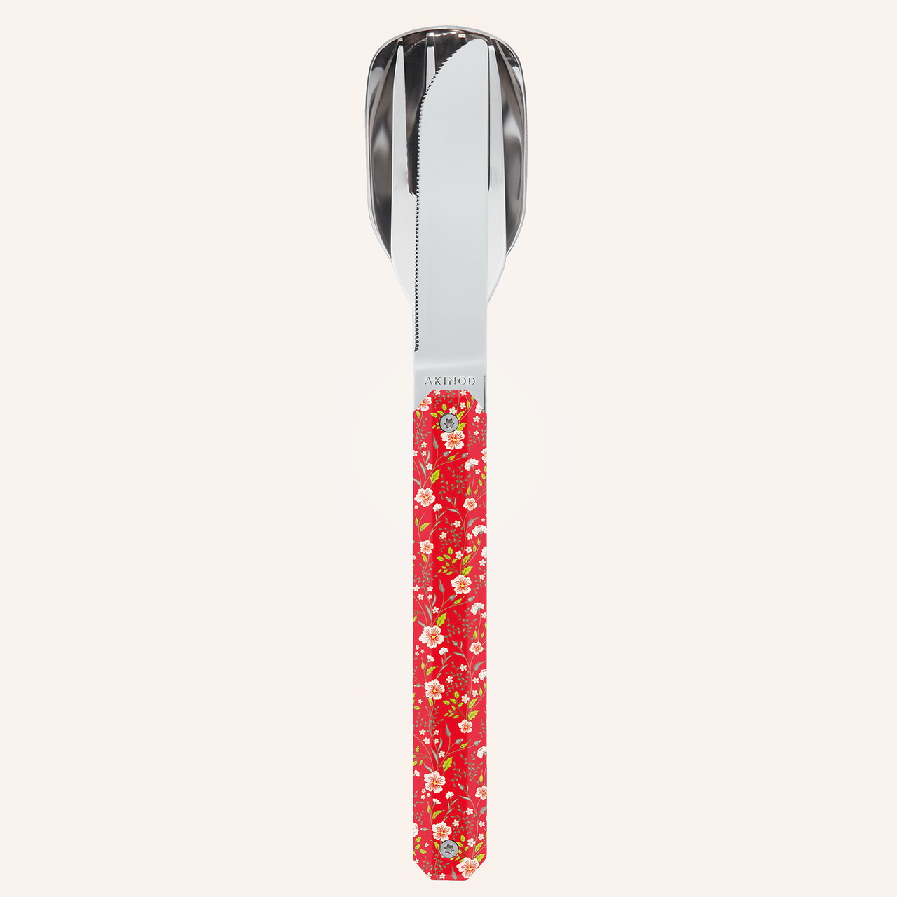 Besteck aus martensitischem Edelstahl 2CR14, hochglanzpoliert. Bestehend aus einem großen Löffel, einer 4-zahnigen Gabel und einem Messer mit einer mikroverzahnten Klinge. Dekorierter, transparenter Polymer (PC)-Griff. Fixierung mittels verbautem Magnet. Geliefert mit einem Trageetui aus Hartpolypropylen (PP). Spülmaschinenfest.
