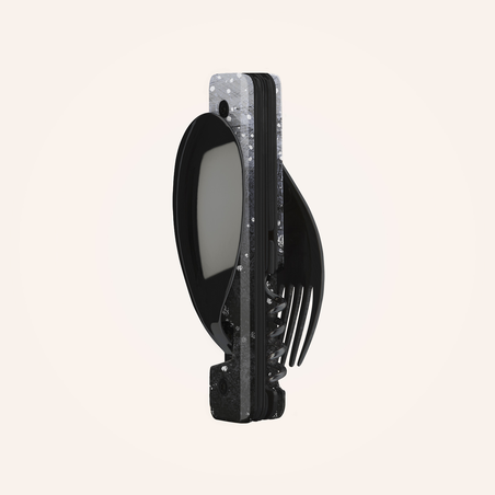 Multifunktionales Besteck aus martensitischem Edelstahl 2CR14, hochglanz schwarz. Bestehend aus einem großen Löffel, einer 5-zahnigen Gabel, einem Messer mit einer mikroverzahnten Klinge, einem Korkenzieher mit 4 Spiralen, einem Dosenöffner und einem Flaschenöffner. Griffbeschlag aus transparentem, dekoriertem Polymer (PC). Fixierung mittels verbautem Magnet. Geliefert mit einem Trageetui aus Hartpolypropylen (PP).