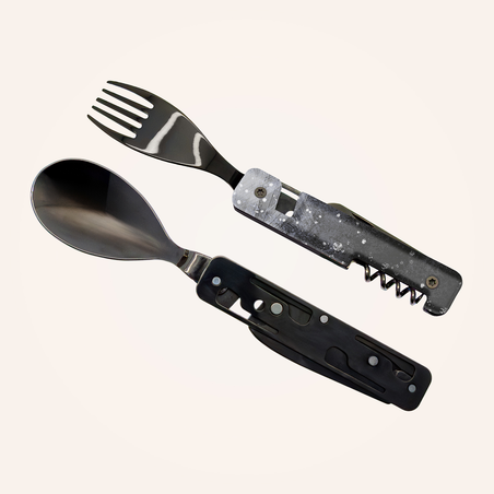 Multifunktionales Besteck aus martensitischem Edelstahl 2CR14, hochglanz schwarz. Bestehend aus einem großen Löffel, einer 5-zahnigen Gabel, einem Messer mit einer mikroverzahnten Klinge, einem Korkenzieher mit 4 Spiralen, einem Dosenöffner und einem Flaschenöffner. Griffbeschlag aus transparentem, dekoriertem Polymer (PC). Fixierung mittels verbautem Magnet. Geliefert mit einem Trageetui aus Hartpolypropylen (PP).