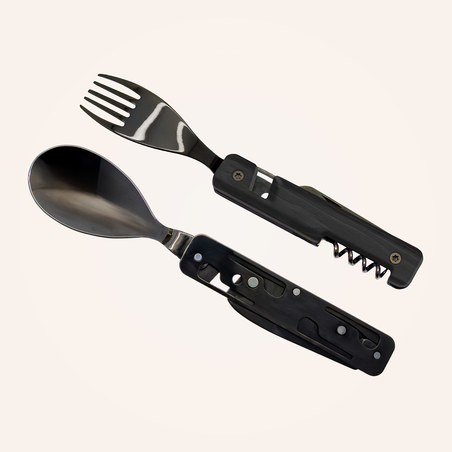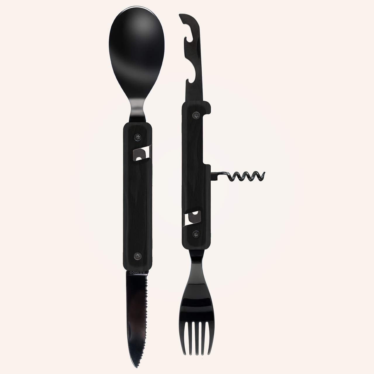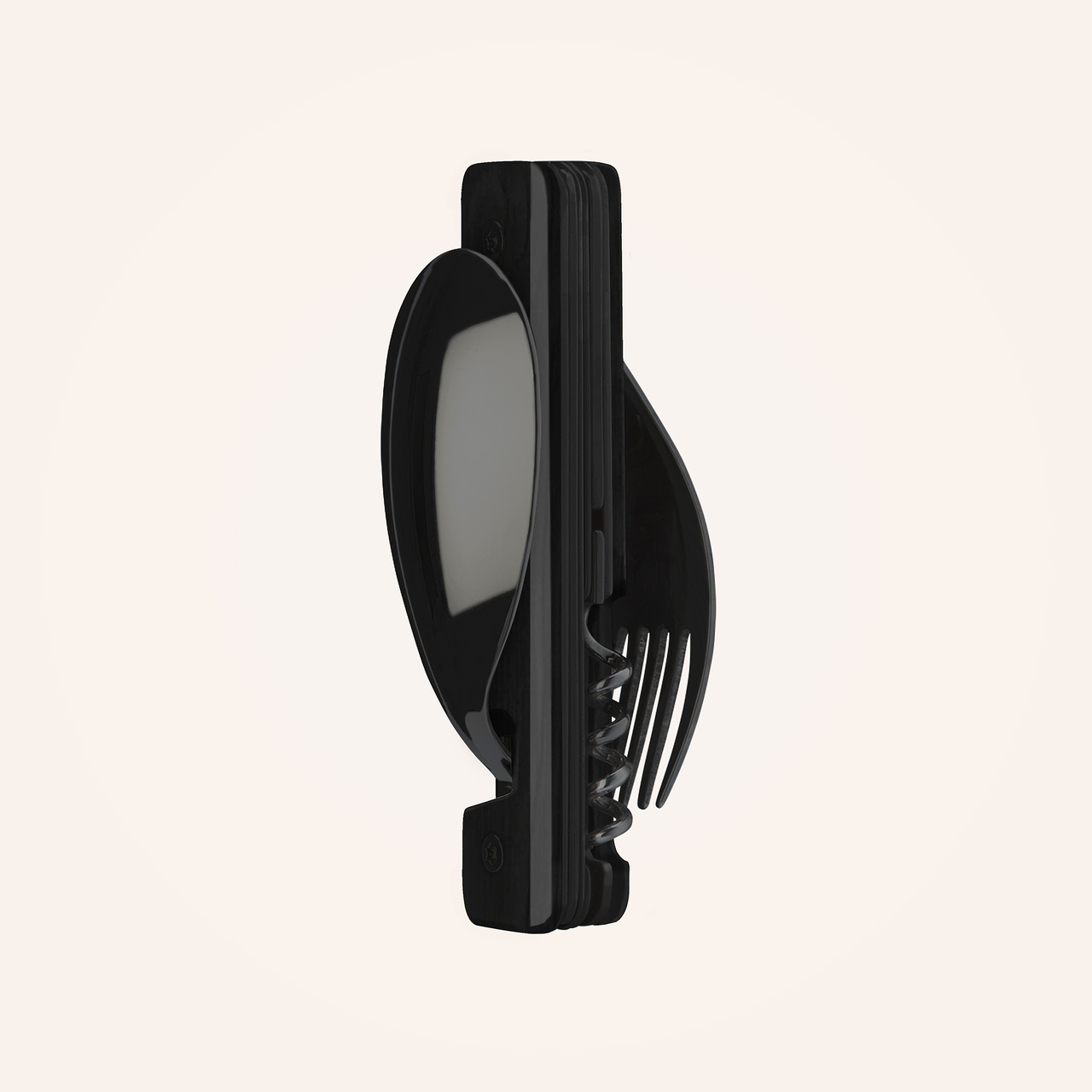 Multifunktionales Besteck aus martensitischem Edelstahl 2CR14, hochglanz schwarz. Bestehend aus einem großen Löffel, einer 5-zahnigen Gabel, einem Messer mit einer mikroverzahnten Klinge, einem Korkenzieher mit 4 Spiralen, einem Dosenöffner und einem Flaschenöffner. Griff aus Ebenholz. Fixierung mittels verbautem Magnet. Geliefert mit einem Trageetui aus Hartpolypropylen (PP).