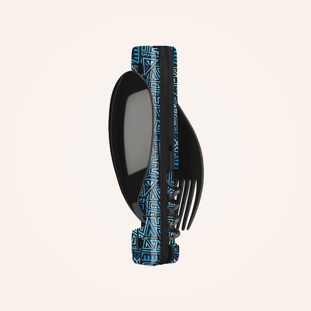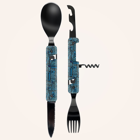 Multifunktionales Besteck aus martensitischem Edelstahl 2CR14, hochglanz schwarz. Bestehend aus einem großen Löffel, einer 5-zahnigen Gabel, einem Messer mit einer mikroverzahnten Klinge, einem Korkenzieher mit 4 Spiralen, einem Dosenöffner und einem Flaschenöffner. Griffbeschlag aus transparentem, dekoriertem Polymer (PC). Fixierung mittels verbautem Magnet. Geliefert mit einem Trageetui aus Hartpolypropylen (PP).