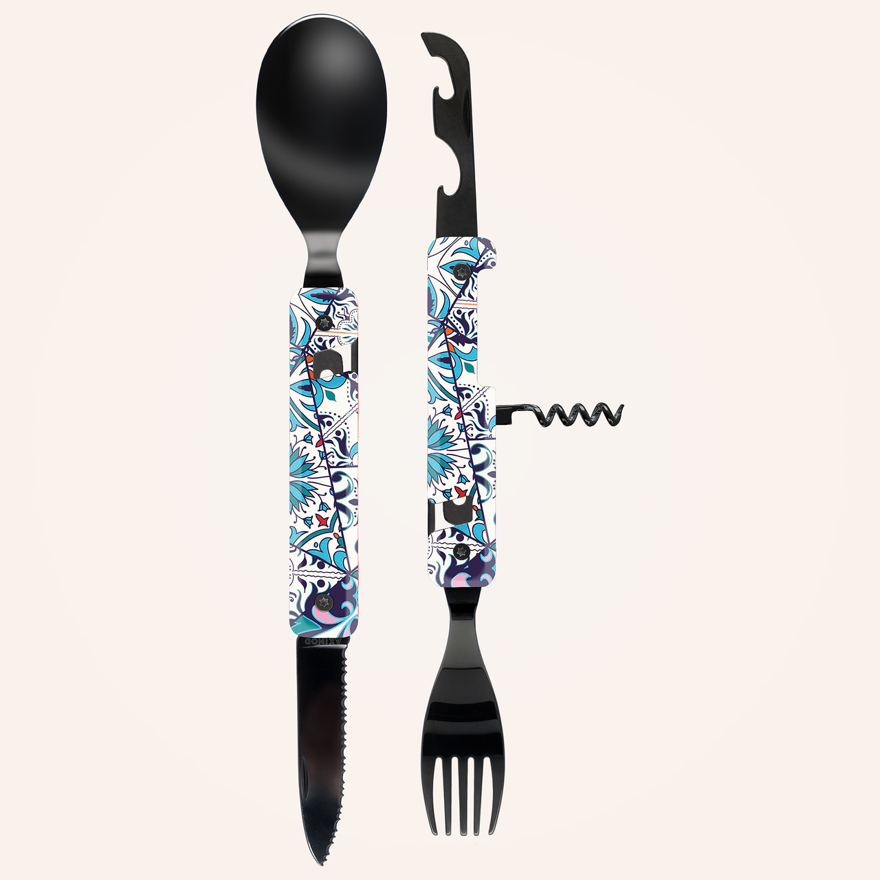 Multifunktionales Besteck aus martensitischem Edelstahl 2CR14, hochglanz schwarz. Bestehend aus einem großen Löffel, einer 5-zahnigen Gabel, einem Messer mit einer mikroverzahnten Klinge, einem Korkenzieher mit 4 Spiralen, einem Dosenöffner und einem Flaschenöffner. Griffbeschlag aus transparentem, dekoriertem Polymer (PC). Fixierung mittels verbautem Magnet. Geliefert mit einem Trageetui aus Hartpolypropylen (PP).
