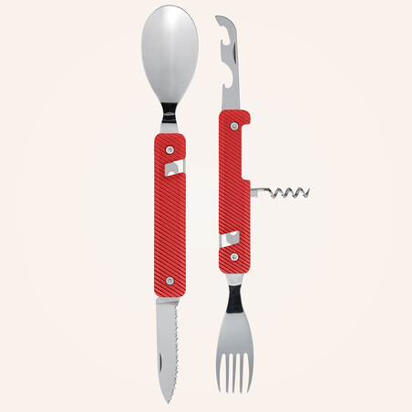Multifunktionales Besteck aus martensitischem Edelstahl 2CR14, hochglanzpoliert. Bestehend aus einem großen Löffel, einer 5-zahnigen Gabel, einem Messer mit einer mikroverzahnten Klinge, einem Korkenzieher mit 4 Spiralen, einem Dosenöffner und einem Flaschenöffner. Griff aus Aluminium. Fixierung mittels verbautem Magnet. Geliefert mit einem Trageetui aus Hartpolypropylen (PP).