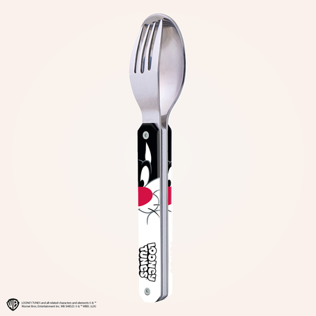 Cutlery in martensitic stainless steel 2CR14, polished mirror finish. Comprises a spoon and a 4-pronged fork. Decorated transparent polymer handle. Magnetic assembly. Delivered with a rigid polypropylene (PP) carrying case. Dishwasher safe.