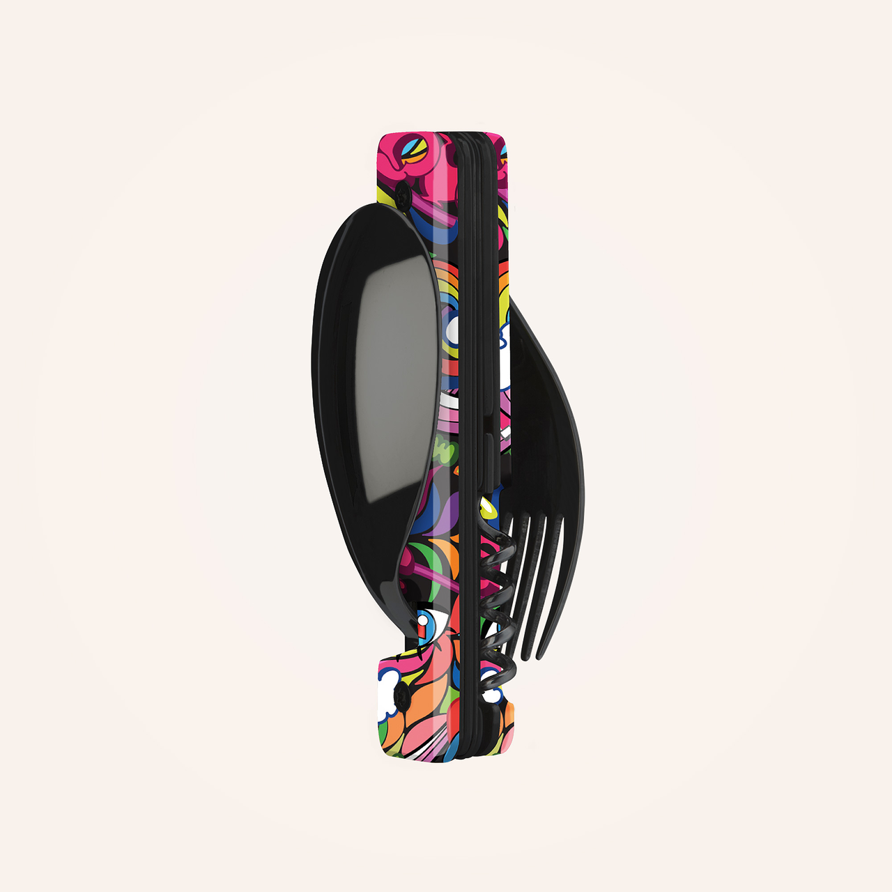 Multifunction cutlery in martensitic stainless steel 2CR14, polished black mirror finish. Comprises a large spoon, a 5-pronged fork, a knife with a micro-serrated blade, a 4-spiral corkscrew, a can-opener and a bottle opener. Decorated transparent polymer (PC) handle. Magnetic assembly. Delivered with a rigid polypropylene (PP) carrying case.