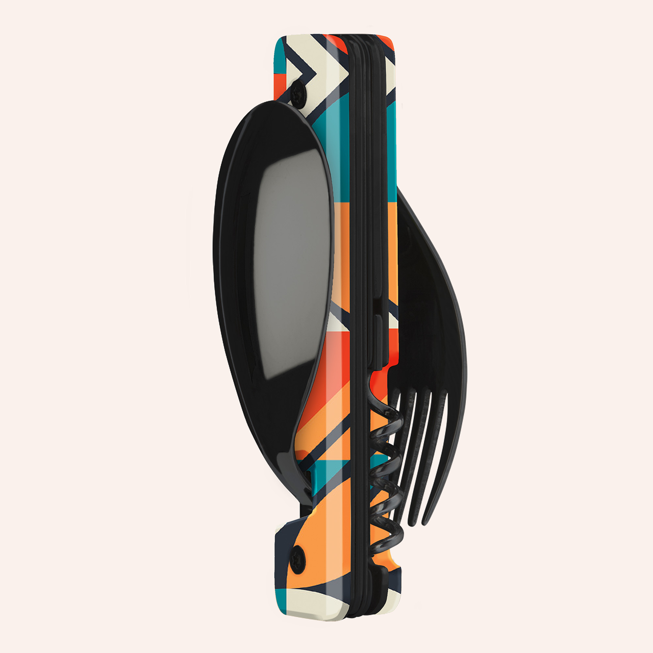Multifunction cutlery in martensitic stainless steel 2CR14, polished black mirror finish. Comprises a large spoon, a 5-pronged fork, a knife with a micro-serrated blade, a 4-spiral corkscrew, a can-opener and a bottle opener. Decorated transparent polymer (PC) handle. Magnetic assembly. Delivered with a rigid polypropylene (PP) carrying case.