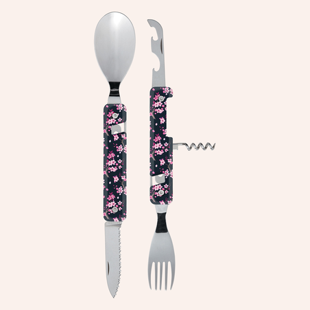 Multifunction cutlery in martensitic stainless steel 2CR14, polished mirror finish. Comprises a large spoon, a 5-pronged fork, a knife with a micro-serrated blade, a 4-spiral corkscrew, a can-opener and a bottle opener. Decorated transparent polymer (PC) handle. Magnetic assembly. Delivered with a rigid polypropylene (PP) carrying case.