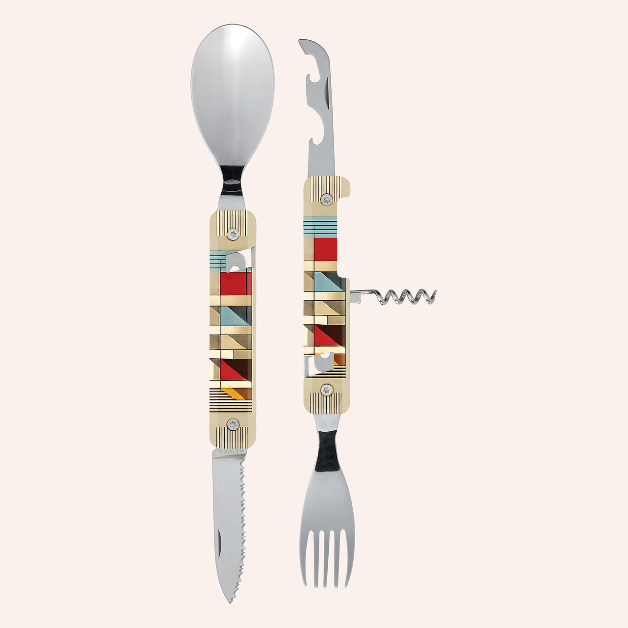 Multifunction cutlery in martensitic stainless steel 2CR14, polished mirror finish. Comprises a large spoon, a 5-pronged fork, a knife with a micro-serrated blade, a 4-spiral corkscrew, a can-opener and a bottle opener. Decorated transparent polymer (PC) handle. Magnetic assembly. Delivered with a rigid polypropylene (PP) carrying case.