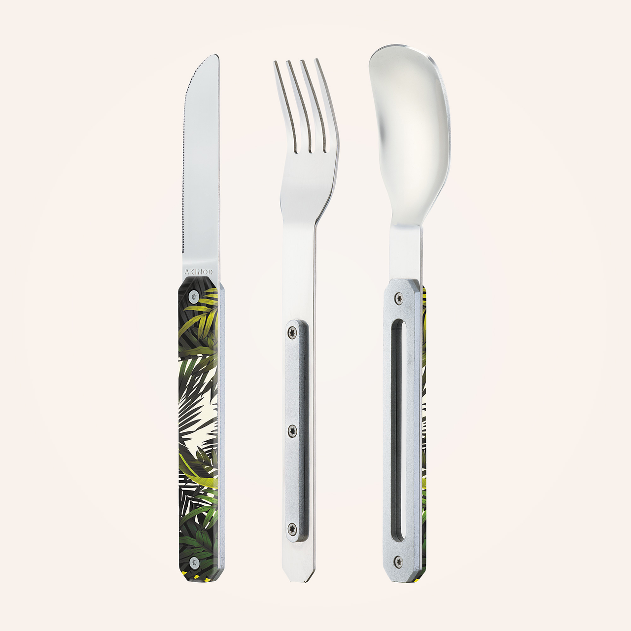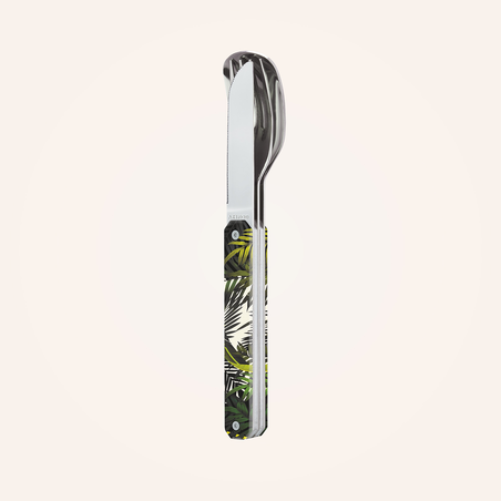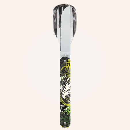 Cutlery in martensitic stainless steel 2CR14, polished mirror finish. Comprises a large spoon, a 4-pronged fork and a knife with a micro-serrated blade. Decorated transparent polymer handle. Magnetic assembly. Delivered with a rigid polypropylene (PP) carrying case. Dishwasher safe.