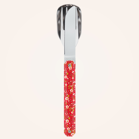 Cutlery in martensitic stainless steel 2CR14, polished mirror finish. Comprises a large spoon, a 4-pronged fork and a knife with a micro-serrated blade. Decorated transparent polymer handle. Magnetic assembly. Delivered with a rigid polypropylene (PP) carrying case. Dishwasher safe.