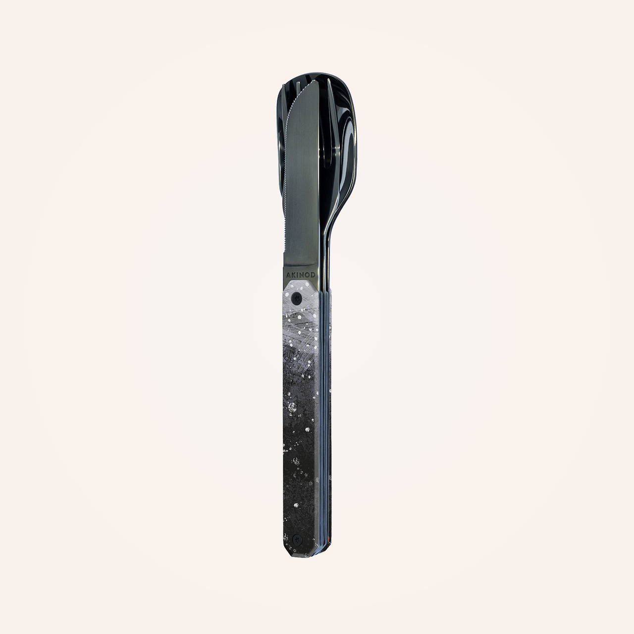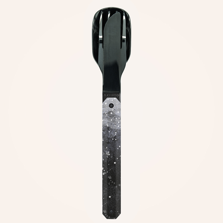 Cutlery in martensitic stainless steel 2CR14, black mirror finish. Comprises a large spoon, a 4-pronged fork and a knife with a micro-serrated blade. Decorated transparent polymer handle. Magnetic assembly. Delivered with a rigid polypropylene (PP) carrying case. Dishwasher safe.