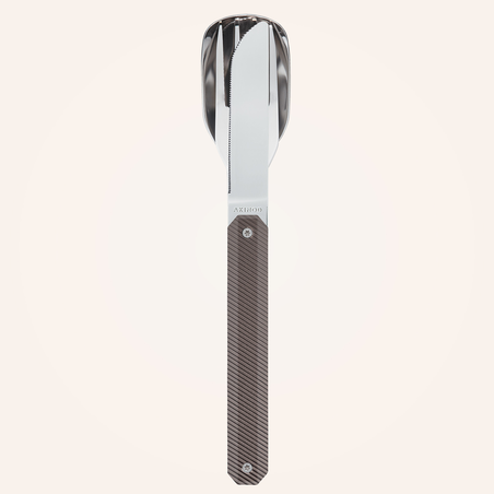 Cutlery in martensitic stainless steel 2CR14, polished mirror finish. Comprises a large spoon, a 4-pronged fork and a knife with a micro-serrated blade. Aluminium handle. Magnetic assembly. Delivered with a rigid polypropylene (PP) carrying case.