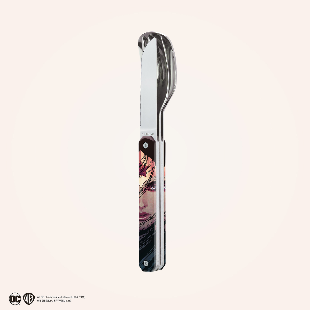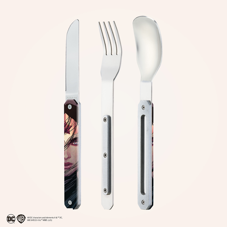 Cutlery in martensitic stainless steel 2CR14, polished mirror finish. Comprises a large spoon, a 4-pronged fork and a knife with a micro-serrated blade. Decorated transparent polymer handle. Magnetic assembly. Dishwasher safe.