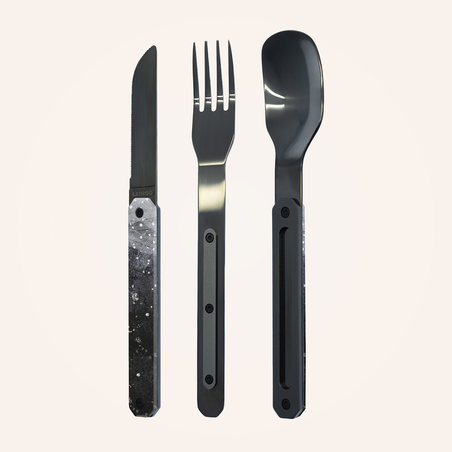 Cutlery in martensitic stainless steel 2CR14, black mirror finish. Comprises a large spoon, a 4-pronged fork and a knife with a micro-serrated blade. Decorated transparent polymer handle. Magnetic assembly. Delivered with a rigid polypropylene (PP) carrying case. Dishwasher safe.
