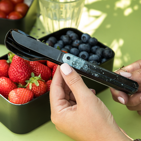 Perfectly dishwasher-safe, your 12:34 polymer cutlery can be washed without special precautions. The serrated edge of the knife guarantees a perfect cut without ever needing sharpening.