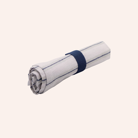 Made from 100% cotton, this Travel Napkin Roll is designed to carry your Akinod cutlery with ease. It protects the contents of your bag, keeps utensils from clinking together, and helps prevent messes. Cutlery slides into a securely sewn pocket inside the napkin. The set is then rolled up and held in place with a wide woven elastic band that also works as a napkin ring.