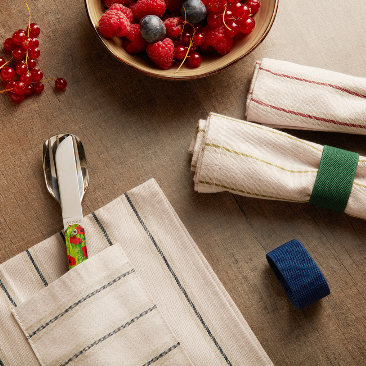 Its simple design is built around a clear idea. A table napkin with a sewn pocket lets you slide in your favorite Akinod cutlery.
