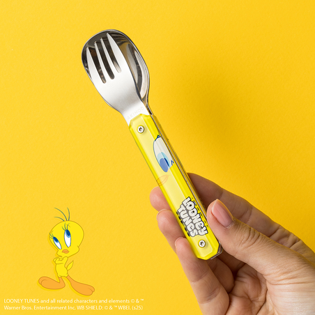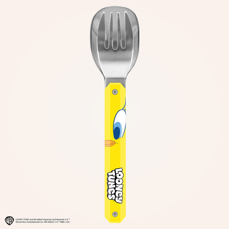 Couverts en acier inoxydable martensitique 2CR14,  finition poli miroir. Composé d’une cuillère et d’une fourchette 4 dents. Manche en polymère (PC) transparent décoré. Assemblage aimanté. Livré avec étui de transport en polypropylène rigide (PP). Compatible lave-vaisselle.