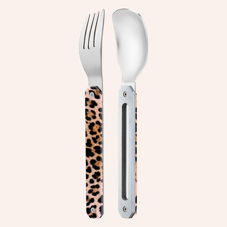 Couverts en acier inoxydable martensitique 2CR14, finition poli miroir. Composé d’une cuillère et d’une fourchette 4 dents. Manche en polymère (PC) transparent décoré. Assemblage aimanté. Livré avec étui de transport en polypropylène rigide (PP). Compatible lave-vaisselle.