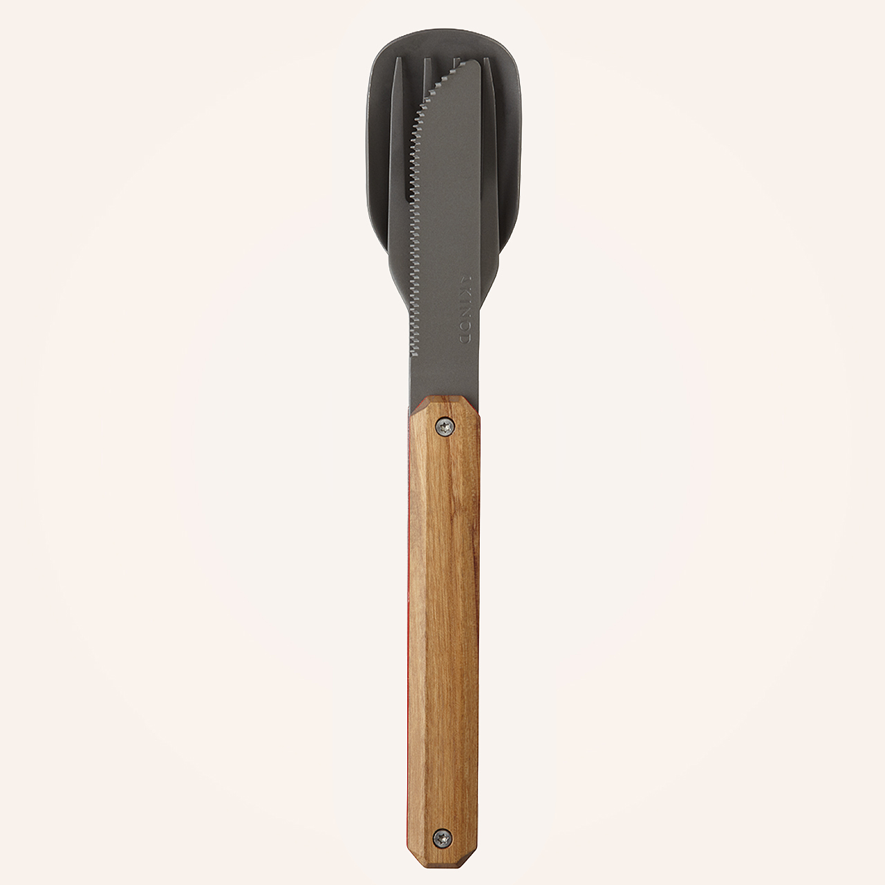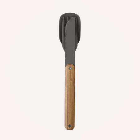 Couverts en acier inoxydable martensitique 2CR14, finition titane gris anthracite. Composé d’une grande cuillère, d’une fourchette 4 dents et d’un couteau à lame micro dentée. Manche en bois d’olivier massif. Assemblage aimanté.