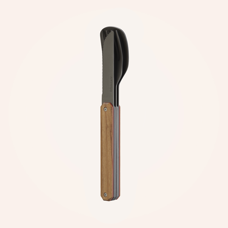 Couverts en acier inoxydable martensitique 2CR14, finition titane gris anthracite. Composé d’une grande cuillère, d’une fourchette 4 dents et d’un couteau à lame micro dentée. Manche en bois d’olivier massif. Assemblage aimanté.