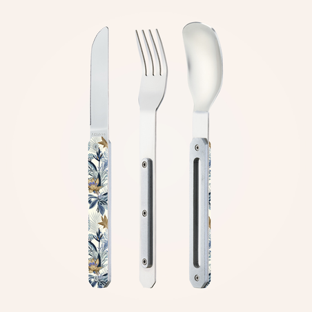 Couverts en acier inoxydable martensitique 2CR14, finition poli miroir. Composé d’une grande cuillère, d’une fourchette 4 dents et d’un couteau à lame micro dentée. Manche en polymère (PC) transparent décoré. Assemblage aimanté. Livré avec étui de transport en polypropylène rigide (PP). Compatible lave-vaisselle.
