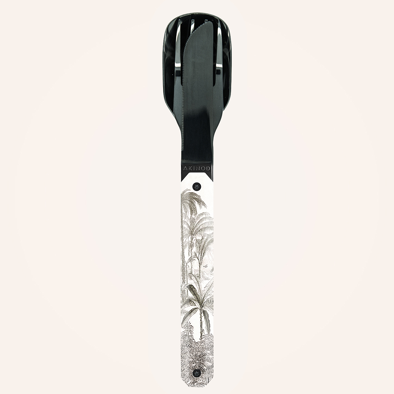 Couverts en acier inoxydable martensitique 2CR14, finition poli miroir noir. Composé d’une grande cuillère, d’une fourchette 4 dents et d’un couteau à lame micro dentée. Manche en polymère (PC) transparent décoré. Assemblage aimanté. Livré avec étui de transport en polypropylène rigide (PP). Compatible lave-vaisselle.