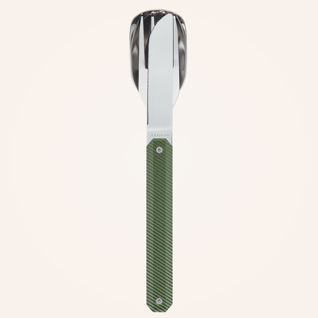 Couverts en acier inoxydable martensitique 2CR14, finition poli miroir. Composé d’une grande cuillère, d’une fourchette 4 dents et d’un couteau à lame micro dentée. Manche aluminium. Assemblage aimanté. Livré avec étui de transport en polypropylène rigide (PP).