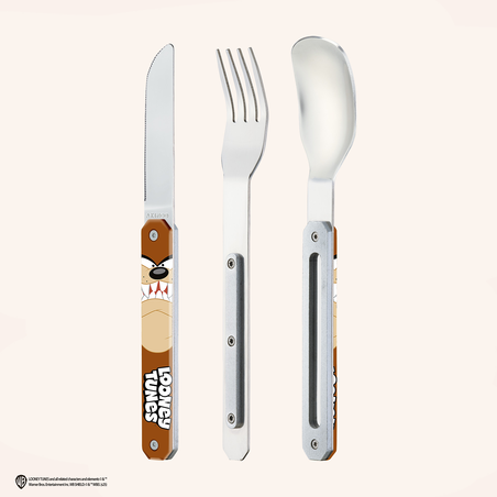 Couverts en acier inoxydable martensitique 2CR14, finition poli miroir. Composé d’une grande cuillère, d’une fourchette 4 dents et d’un couteau à lame micro dentée. Manche en polymère (PC) transparent décoré. Assemblage aimanté. Compatible lave-vaisselle.
