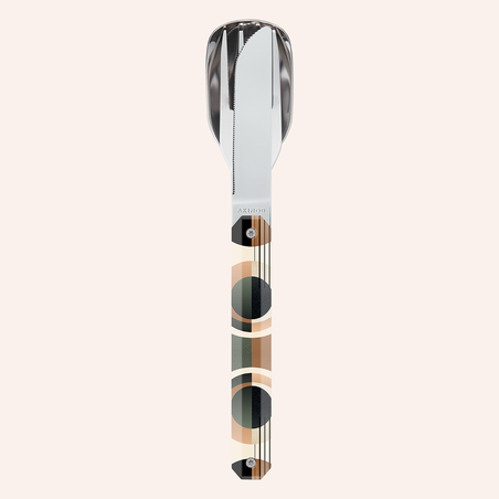 Couverts en acier inoxydable martensitique 2CR14, finition poli miroir. Composé d’une grande cuillère, d’une fourchette 4 dents et d’un couteau à lame micro dentée. Manche en polymère (PC) transparent décoré. Assemblage aimanté.