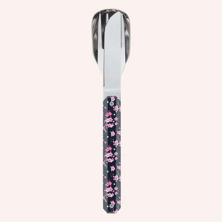 Couverts en acier inoxydable martensitique 2CR14, finition poli miroir. Composé d’une grande cuillère, d’une fourchette 4 dents et d’un couteau à lame micro dentée. Manche en polymère (PC) transparent décoré. Assemblage aimanté.