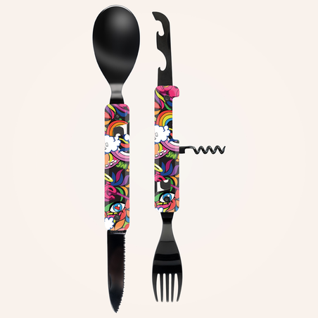 Couverts multifonctions en acier inoxydable martensitique 2CR14, finition noire brillante. Composé d’une grande cuillère, d’une fourchette 5 dents, d’un couteau à lame micro dentée, d’un tire-bouchon 4 spirales, d’un outre boîte et d’un décapsuleur. Manche en polymère (PC) transparent décoré. Assemblage aimanté. Livré avec étui de transport en polypropylène rigide (PP).