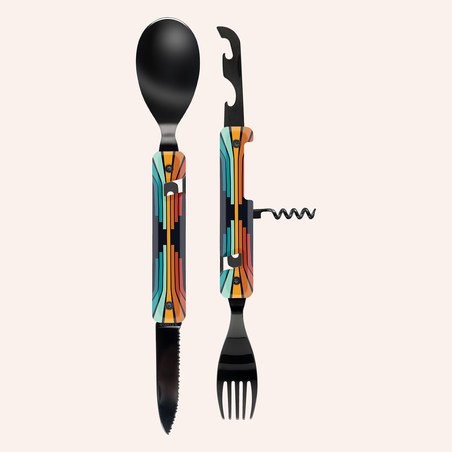 Couverts multifonctions en acier inoxydable martensitique 2CR14, finition noire brillante. Composé d’une grande cuillère, d’une fourchette 5 dents, d’un couteau à lame micro dentée, d’un tire-bouchon 4 spirales, d’un outre boîte et d’un décapsuleur. Manche en polymère (PC) transparent décoré. Assemblage aimanté. Livré avec étui de transport en polypropylène rigide (PP).